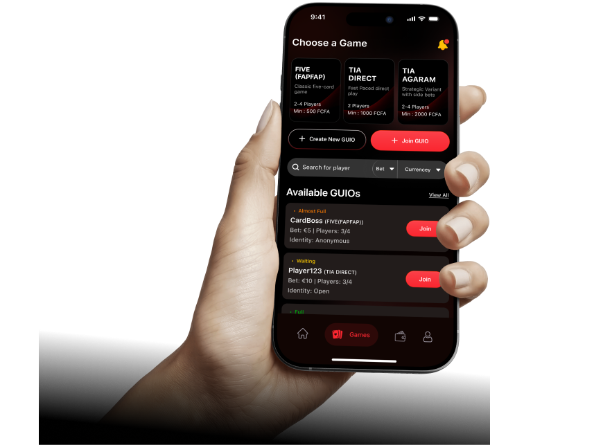 Join real players, create or join game rooms (GUIO), place bets in FCFA, EUR, or USD, and win based on strategy — not luck alone.